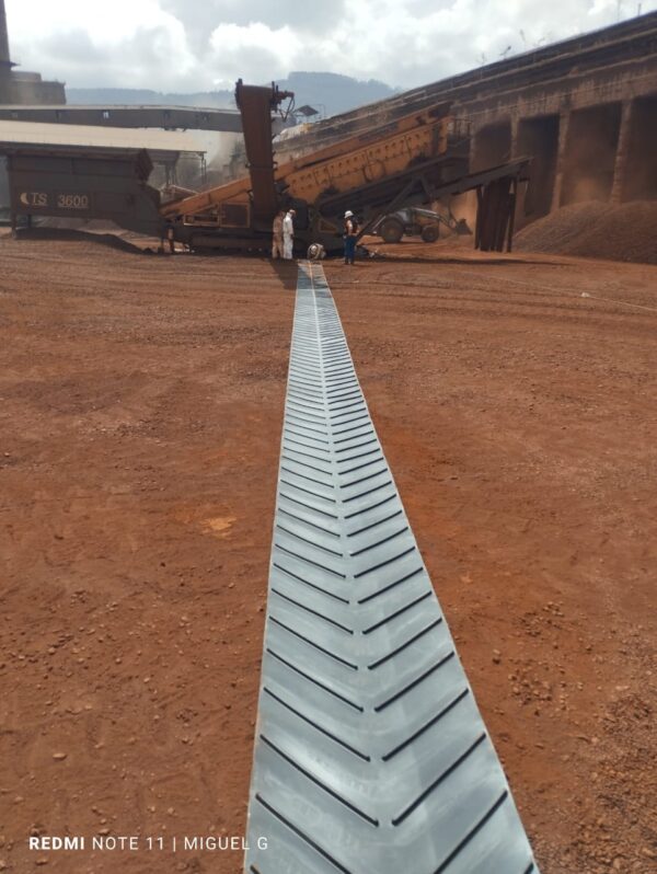 Banda nervada EP400-3-1/8*1-6 espesor total 7.5 altura de los nervios 12-15-22 mm en espina de pescado o chevron , diámetro mínimo de tambor motriz 16 pulg y de cola 14 pulg, carga de trabajo recomendada 228.4lbs-pulg temperatura recomendada 60*c dureza 65 SHORE.A RM1, cubierta en caucho SBR 3 lonas internas en poliéster nylon, resistente al corte y abrasión.